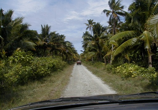 At the extreme left under the clouds is the unpopulated island of Takutea. Atiu's villages are in the center of the island at its highest part. The air strip is at the upper right-center of the island in both photos and on the map. With the following photos I travel from left to right on the road toward the airstrip, but turn right before reaching it and continue around the island toward the left.