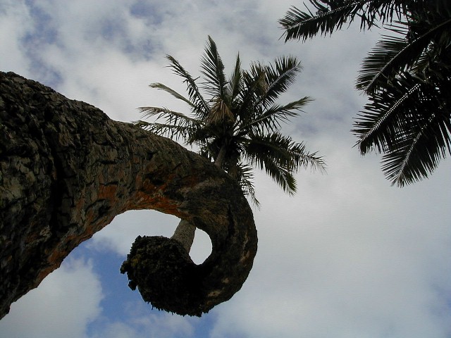 .When I arrive on Rarotonga, I rent a Kawasaki motorcycle then drive the 20 miles around the island. One of the places I stop is at Muri Beach and the lagoon. I go to visit my favorite coconut tree...a survivor of the 1987 Sally IV hurricane. No, the hurricane didn't twist it, but it did survive with that looped trunk.