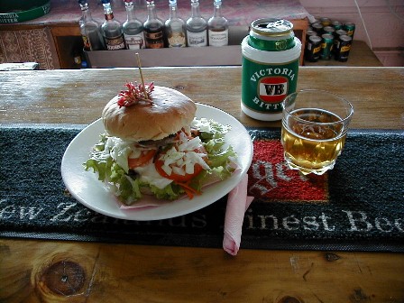 A hamburger and beer at Metua's.