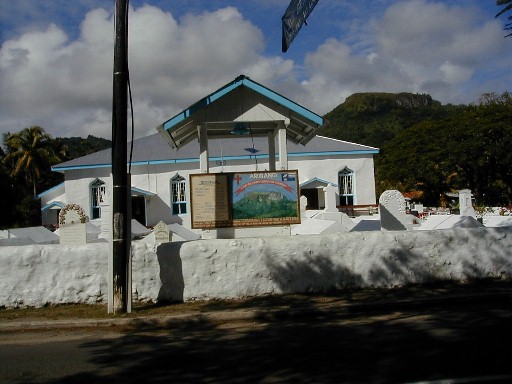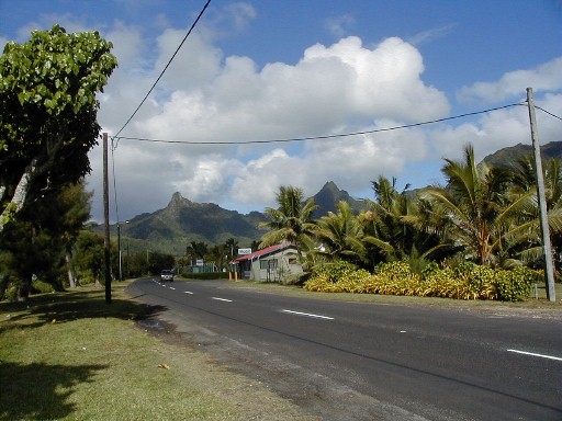 On Rarotonga one sees graves above ground in yards and in cemeteries. Here are some photos of a cemetery not too far from the airport. The view of the road and mountains first.