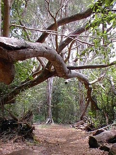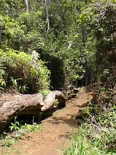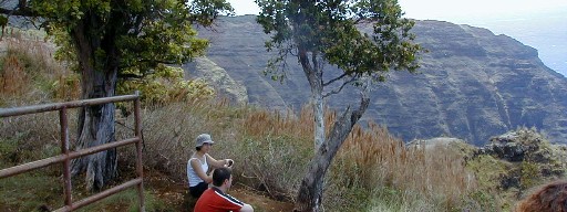 Later we all started down the Awa'awapuhi trail. After a mile and a half, my recently wounded foot stepped on too many roots, rocks, etc., so I turned back to make sure that I would make it.The young ones went on, Renee taking the better camera to record the view.